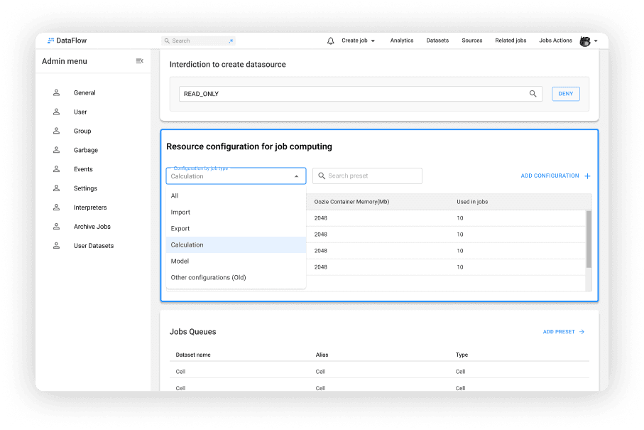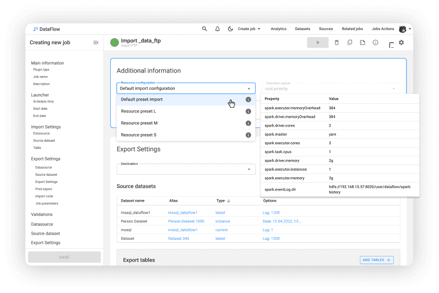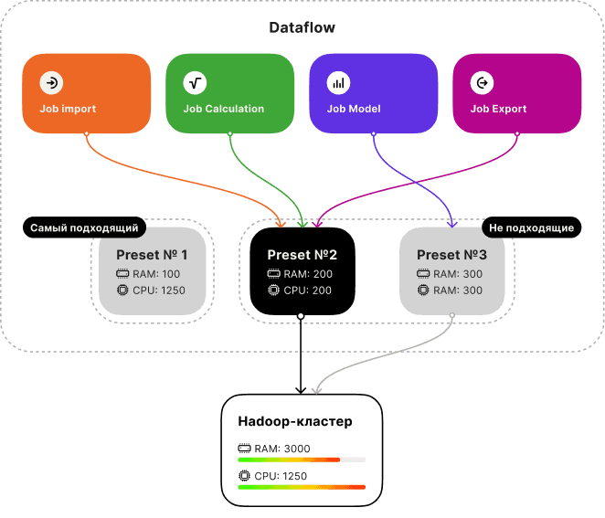DataFlow — это набор созданных операций (jobs). Каждая операция (job) имеет множество настроек, одна из которых — пресеты. Пресеты отвечают за конфигурацию CPU и RAM (физической и оперативной памяти).