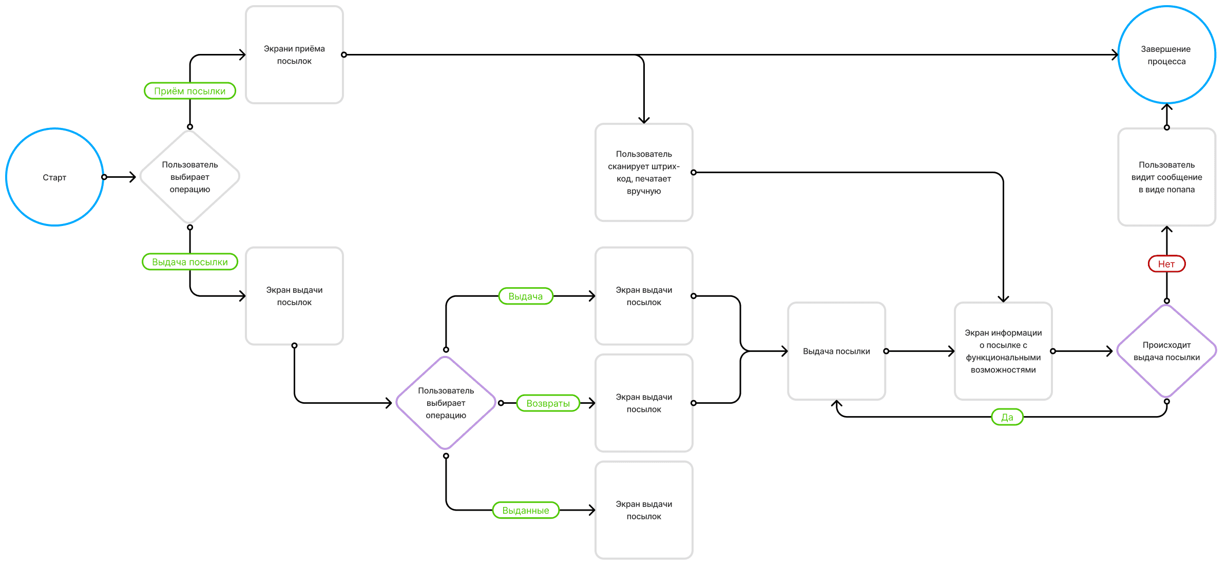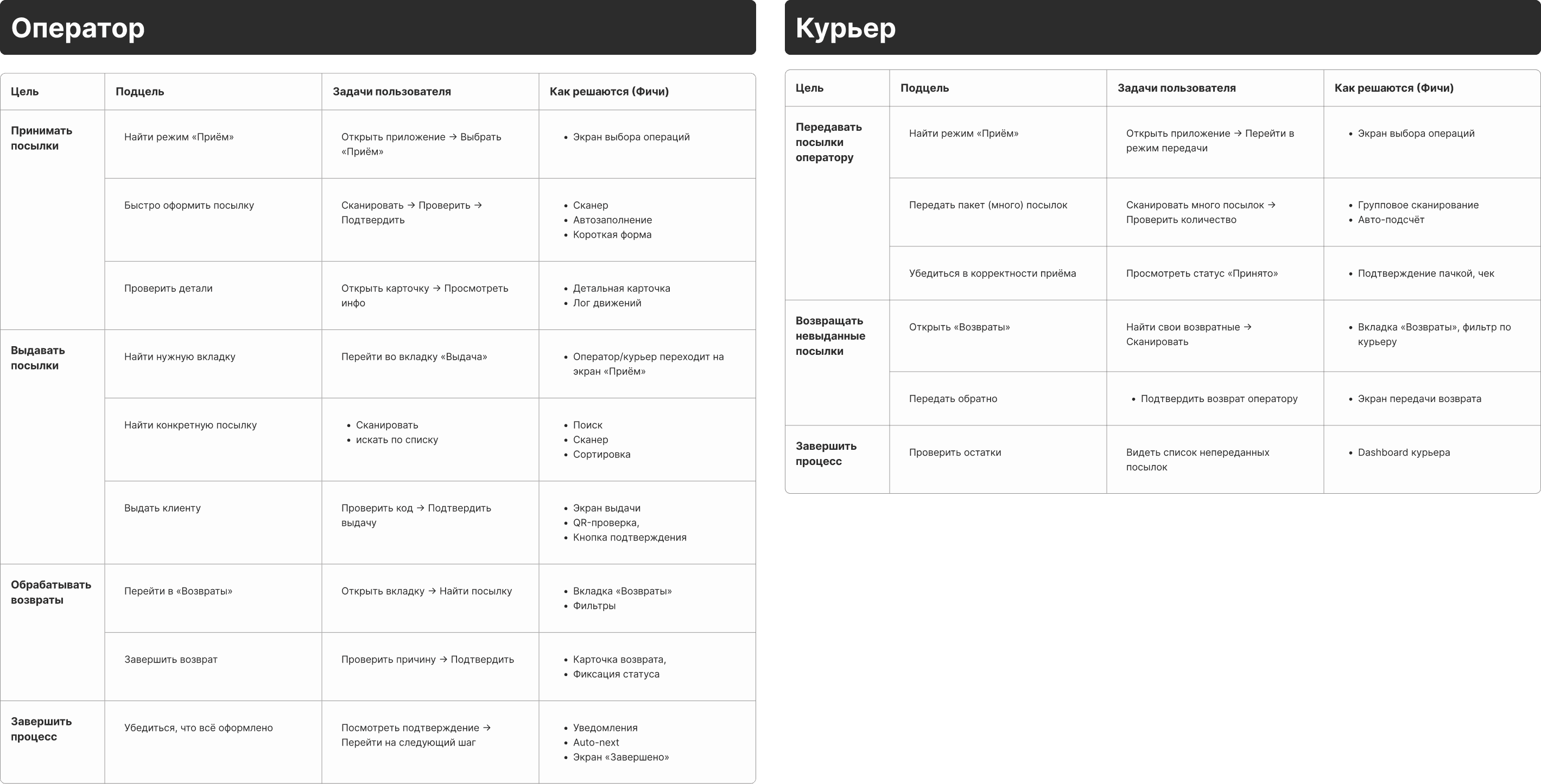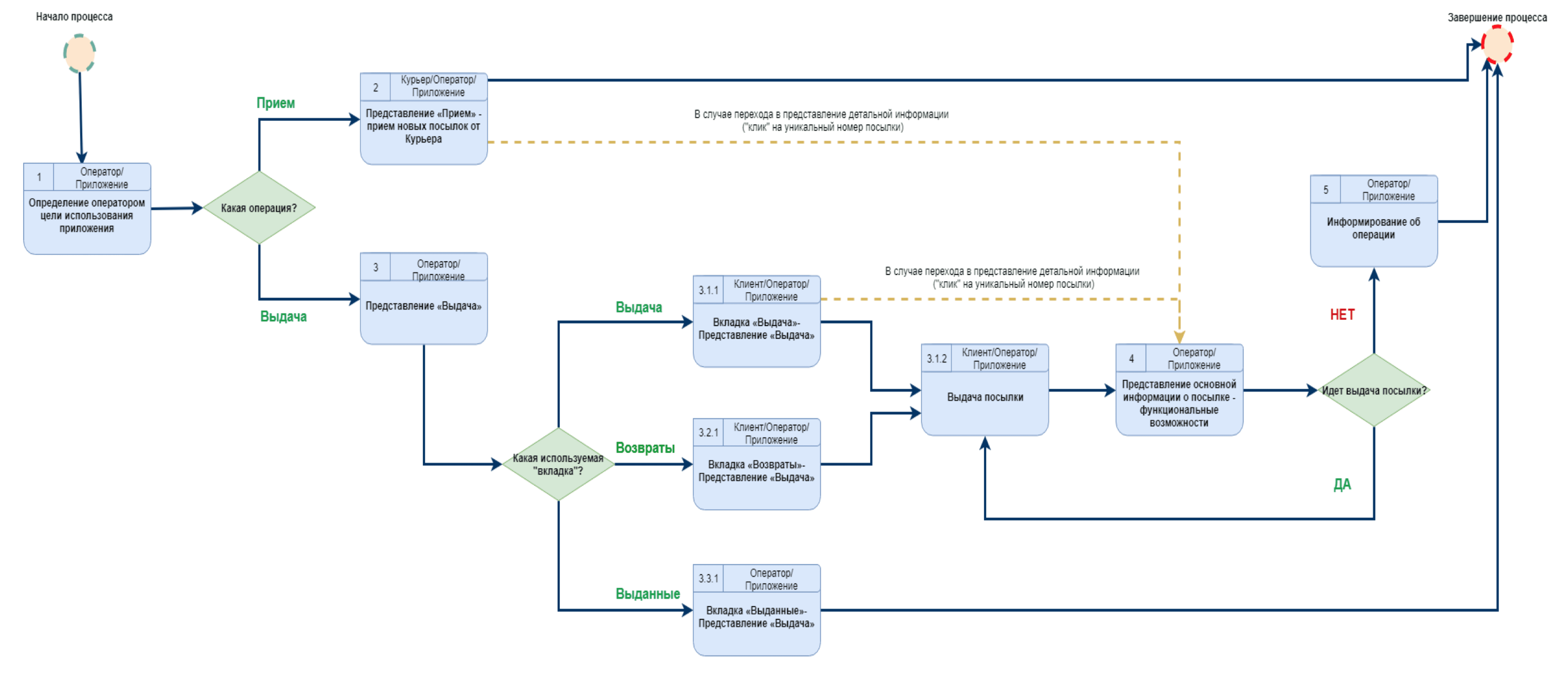Обработка — работа с посылками от курьеров, передача курьерам, возвраты и поиск